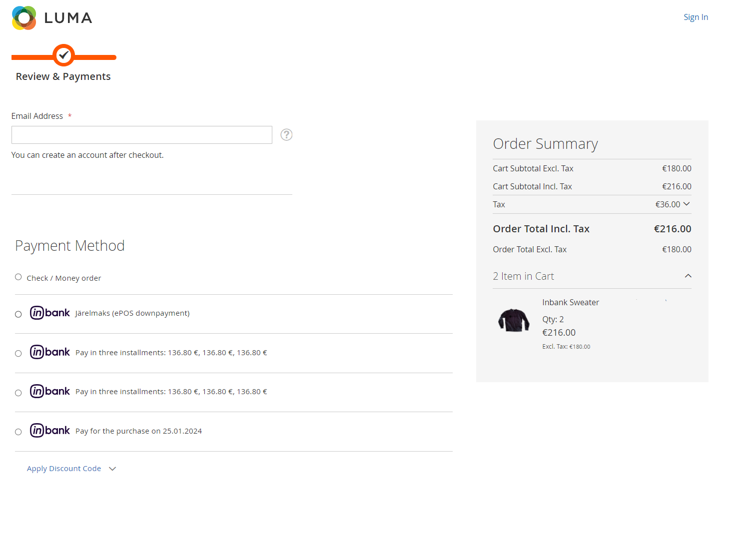 Note that the following screenshots are only demonstrational. The actual way the Inbank payment solution appears in your Magento store depends on the extension settings, the Inbank branch with which you have concluded the contract, the theme and locale of your store.