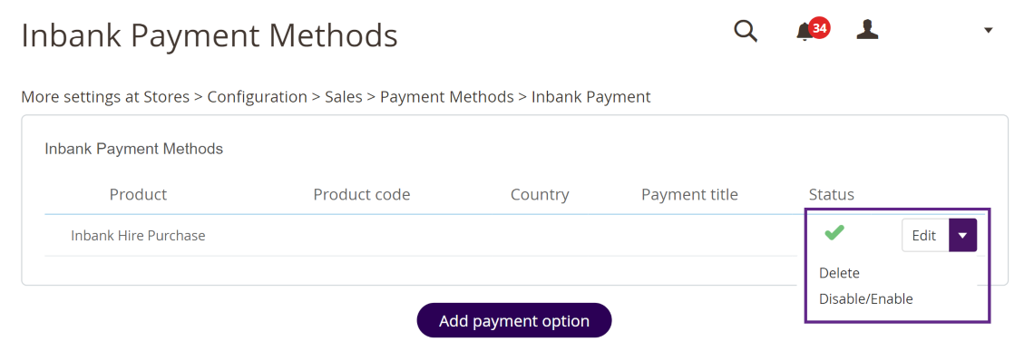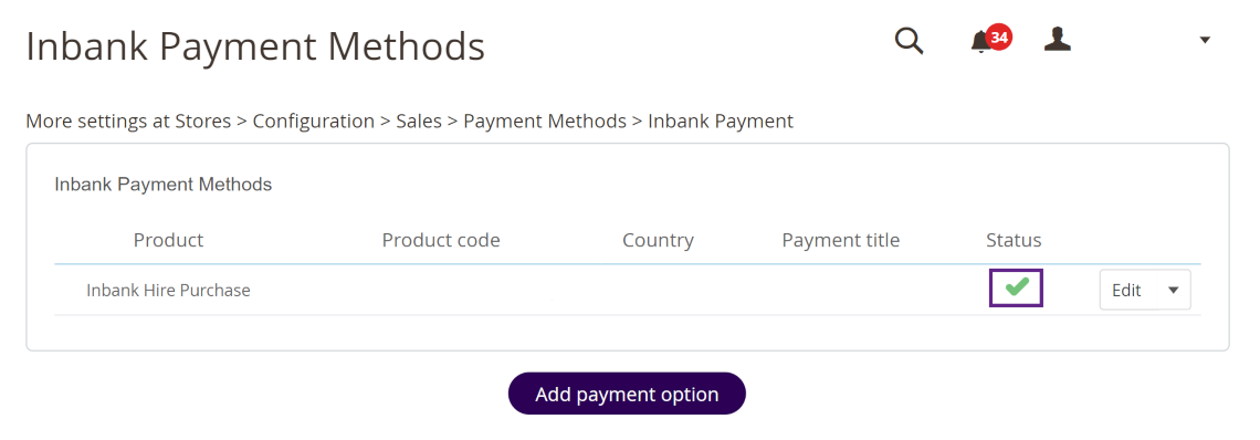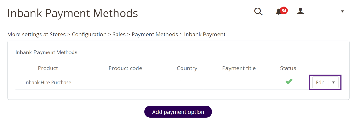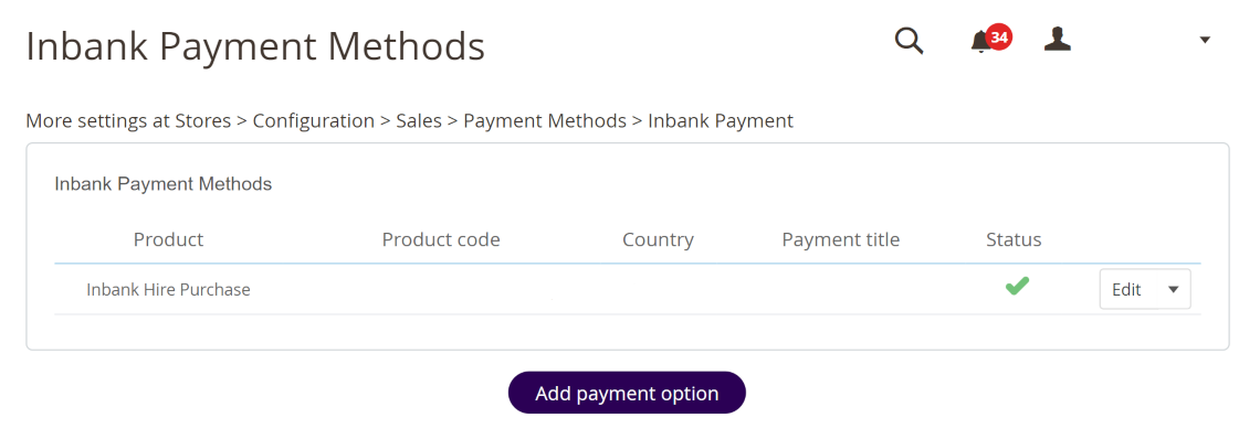 To start adding a new Inbank payment product, click Add payment option at Stores > Settings > Inbank.
