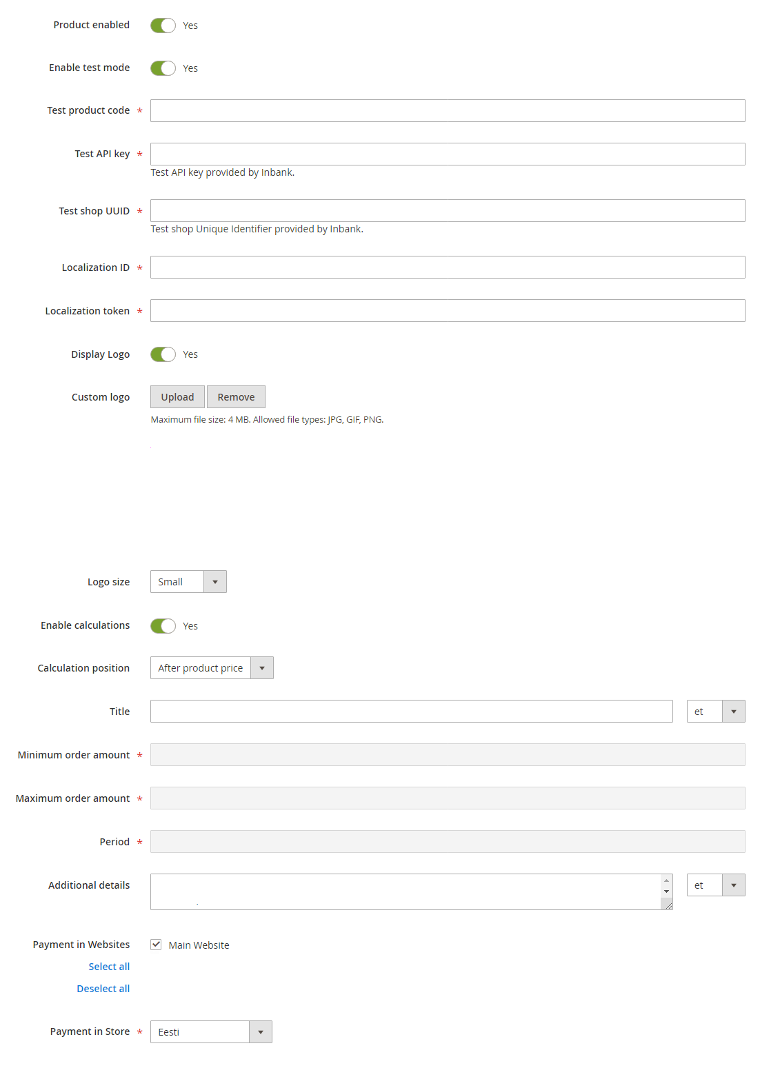 For testing purposes, you need to specify several parameters in the payment methods settings at Stores > Settings > Inbank. When adding a new payment option you need to: