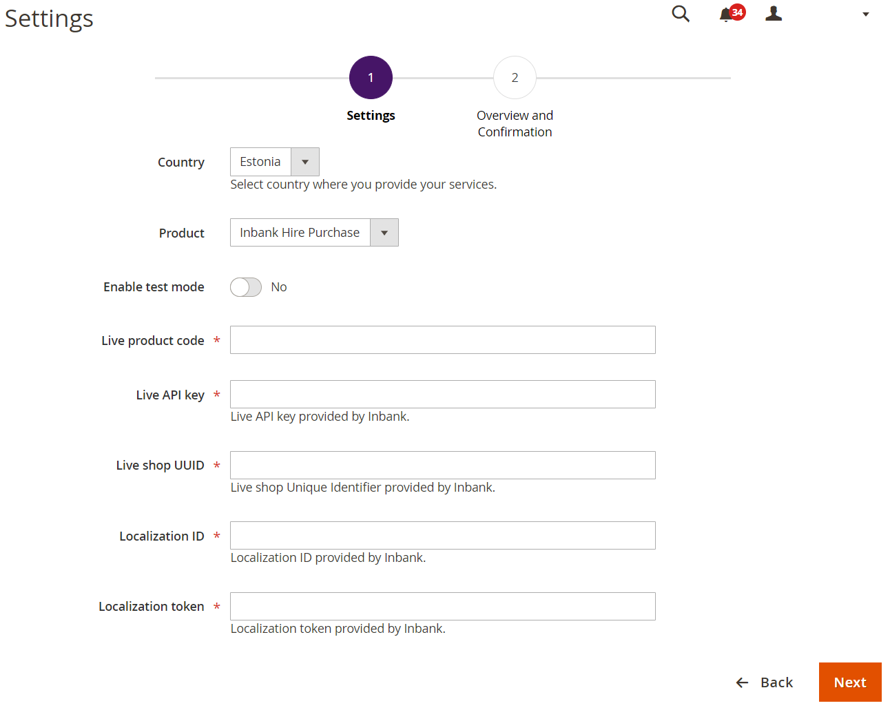 Step 1 includes the essential parameters needed for the payment option setup. Inbank representatives will provide you all the information needed at this step. After you add the necessary data, click Next to proceed to step 2 where you review the configuration and can set a number of additional parameters for the payment option.