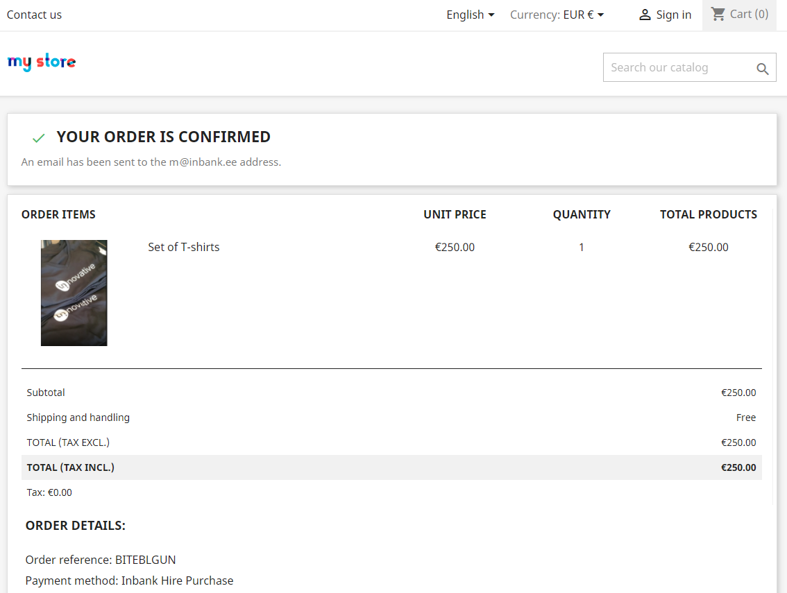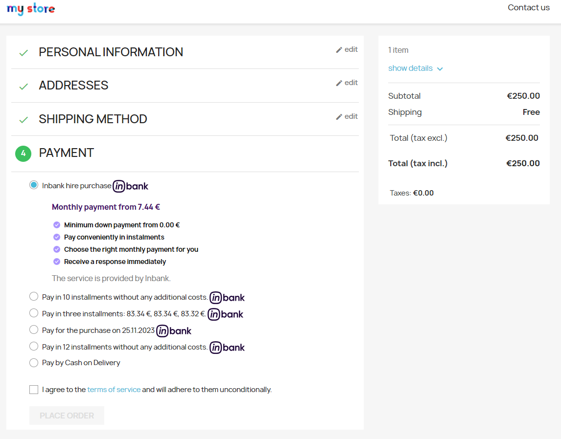 If the purchase has been financed by Inbank, the customer will be redirected to the page configured in your PrestaShop instance as the payment success page. Otherwise, the customer will be redirected back to the cart.