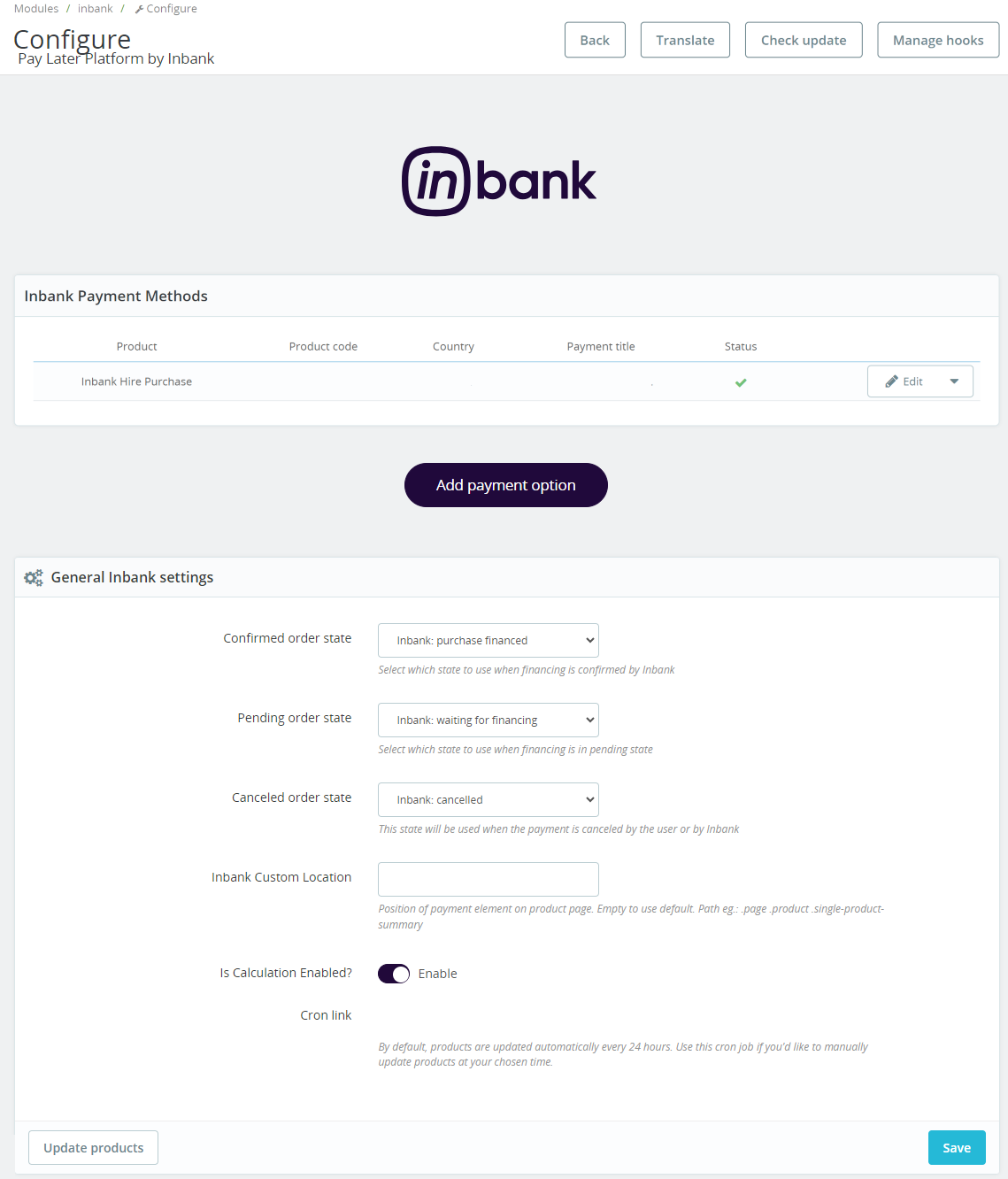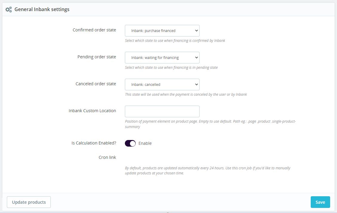 You can also manually have the Inbank plugin check for updates whenever you need. To do this just go to Payment > Inbank Settings and click Update products. The plugin will update the configuration settings and that is it! Now your plugin has all the latest data from Inbank.