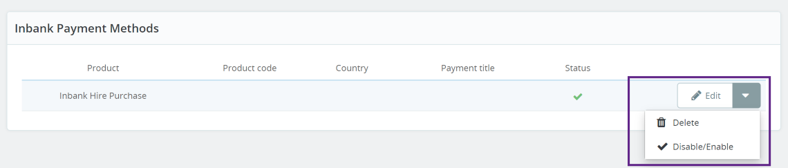 - Click the dropdown button next to a payment option to enable/disable or delete it.