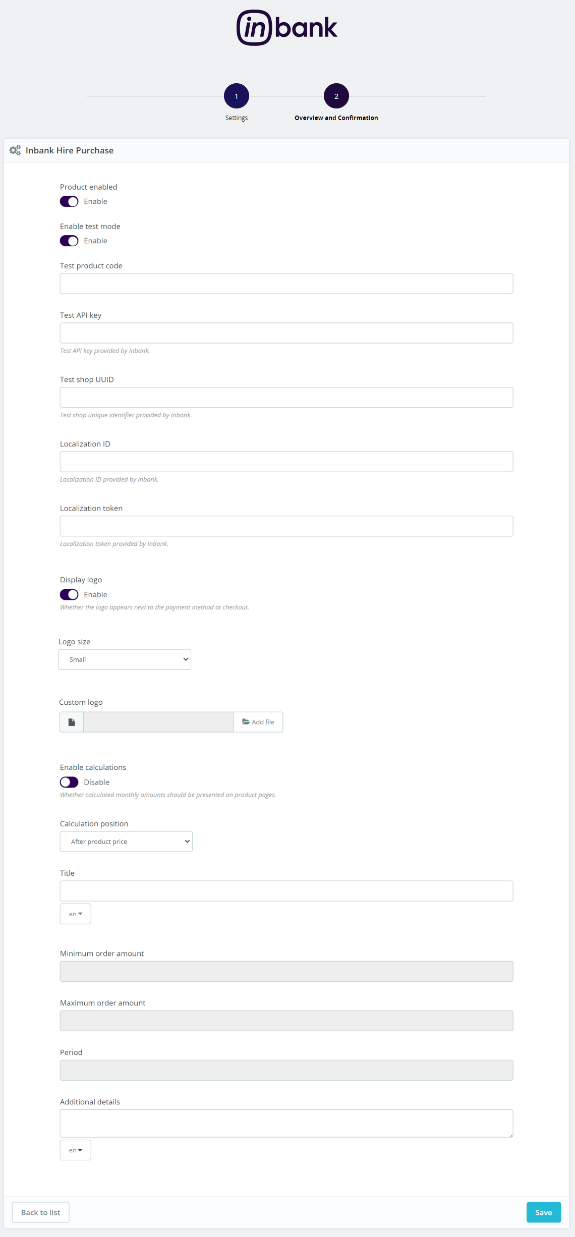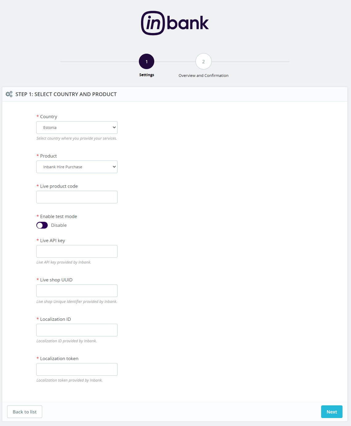 Step 1 includes the essential parameters needed for the payment option setup. Inbank representatives will provide you all the information needed at this step.