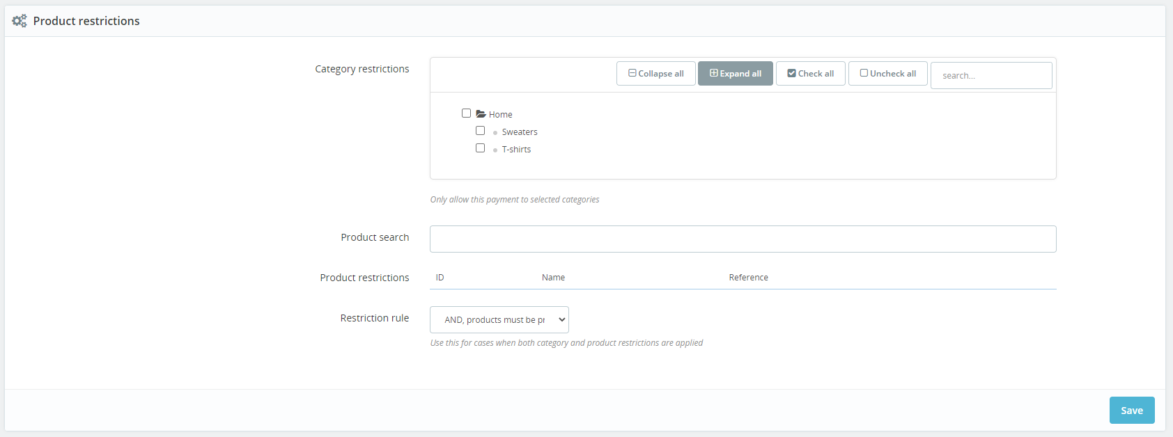 - OR, products can be present in selected categories or product restrictions. If this rule is applied, the Inbank payment method will be available for all products which belong to the category(s) selected in the Category restrictions and all products listed under the Product restrictions even if they are from different categories. If there are no products listed under Product restrictions, the payment method will be applicable to all products, regardless of their category.
