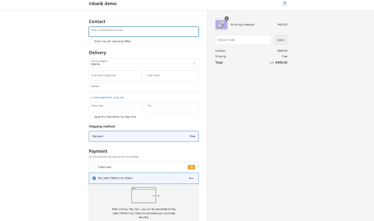 Note that the following screenshots are only demonstrational. The actual way the Inbank payment methods appear in your Shopify store depends on the storefront theme, Inbank settings, the Inbank branch with which you have concluded the contract and the locale of your store.