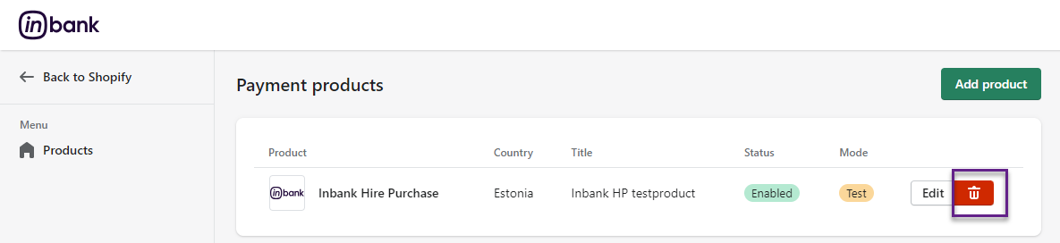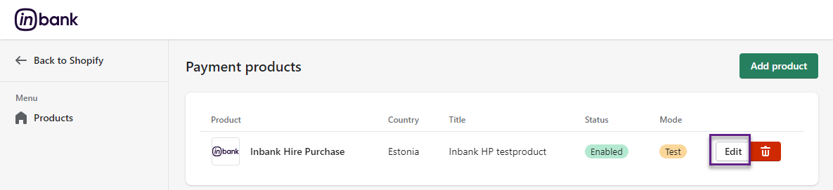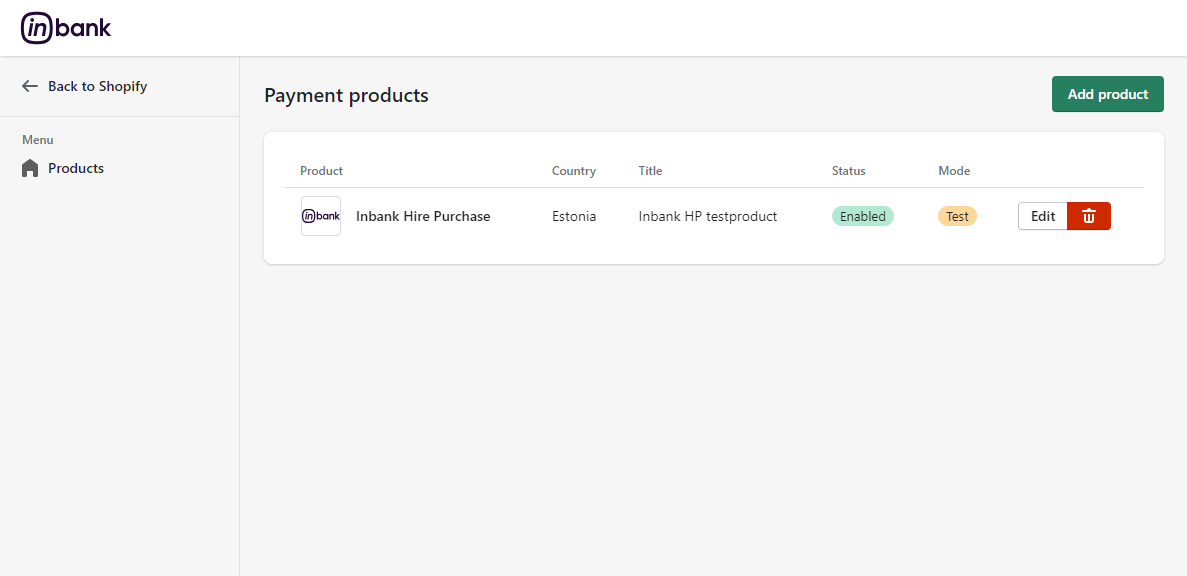 To start adding a new Inbank payment product, click Add product at Settings > Payments > Inbank >