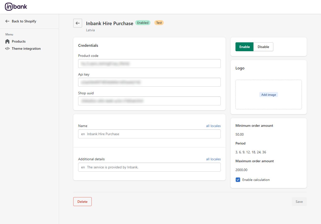 Inbank provides a dedicated staging environment for testing the integration with payment solutions. For testing purposes, you need to specify several parameters in the payment method settings at Add product at Settings > Payments > Inbank > Manage > Manage.
