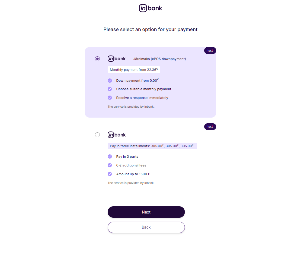 3. Once customers choose Inbank as their payment method and click Complete order, they are redirected to the Inbank environment where they first choose the preferred Inbank payment product and then go through a number of dialogs to complete the financing of the purchase.