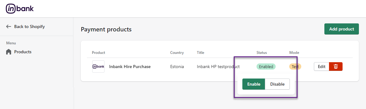 | Enable/Disable | Whether this Inbank product should be available to customers as a payment option.|
