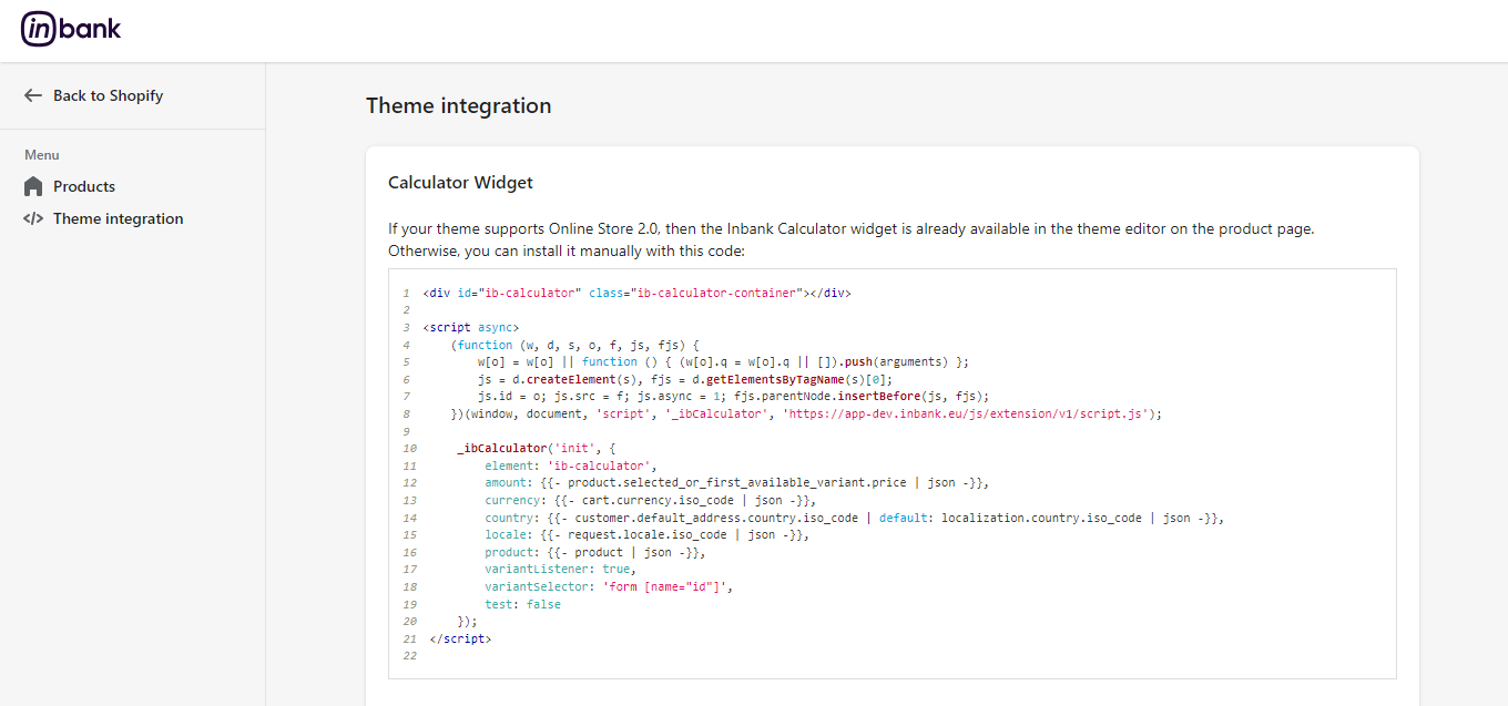 If your store theme does not support Online Store 2.0, you can add the Inbank calculations manually using the code provided on the Theme integration page.
