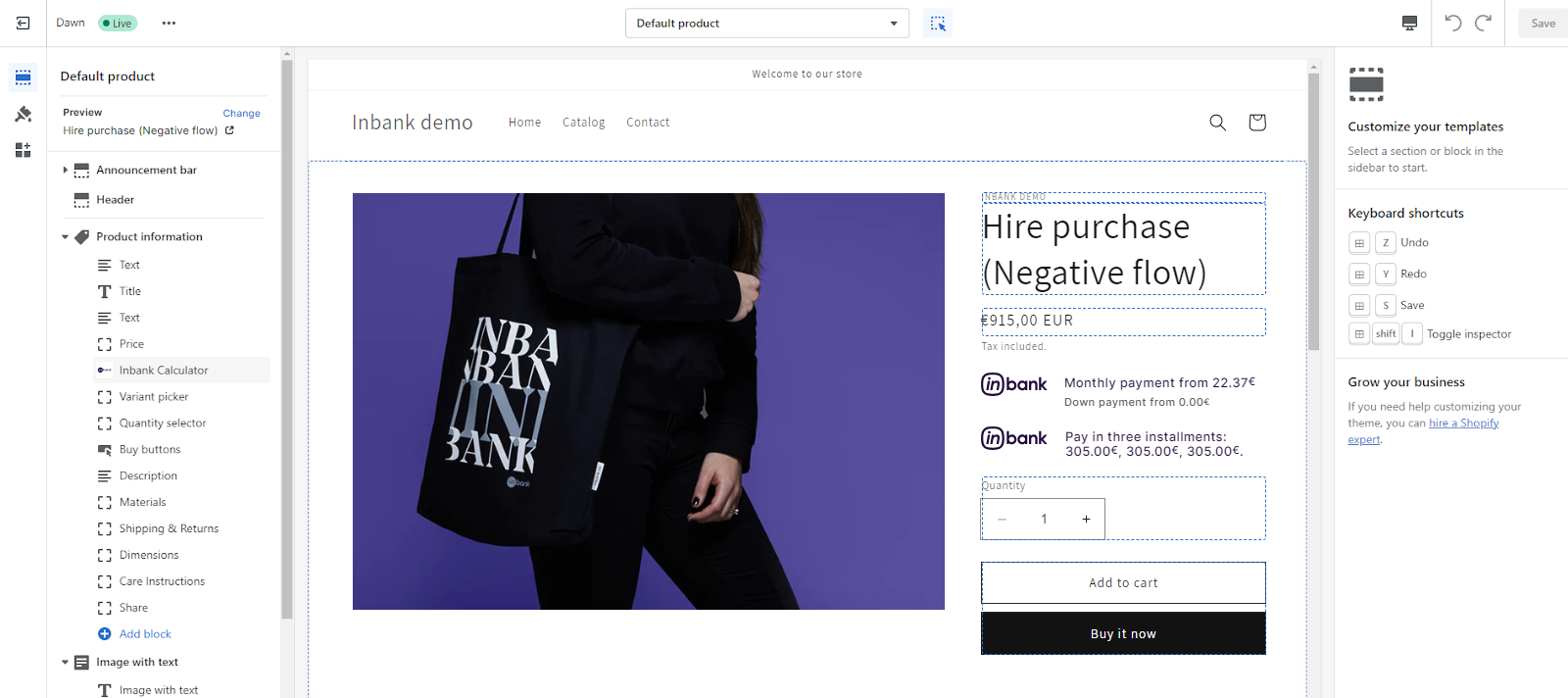 If your store theme supports Online Store 2.0, then Inbank calculations are automatically available with the Pay Later Platform in the theme editor on the product page. By default, calculations are enabled in the Inbank settings and just need to be added to the store theme.