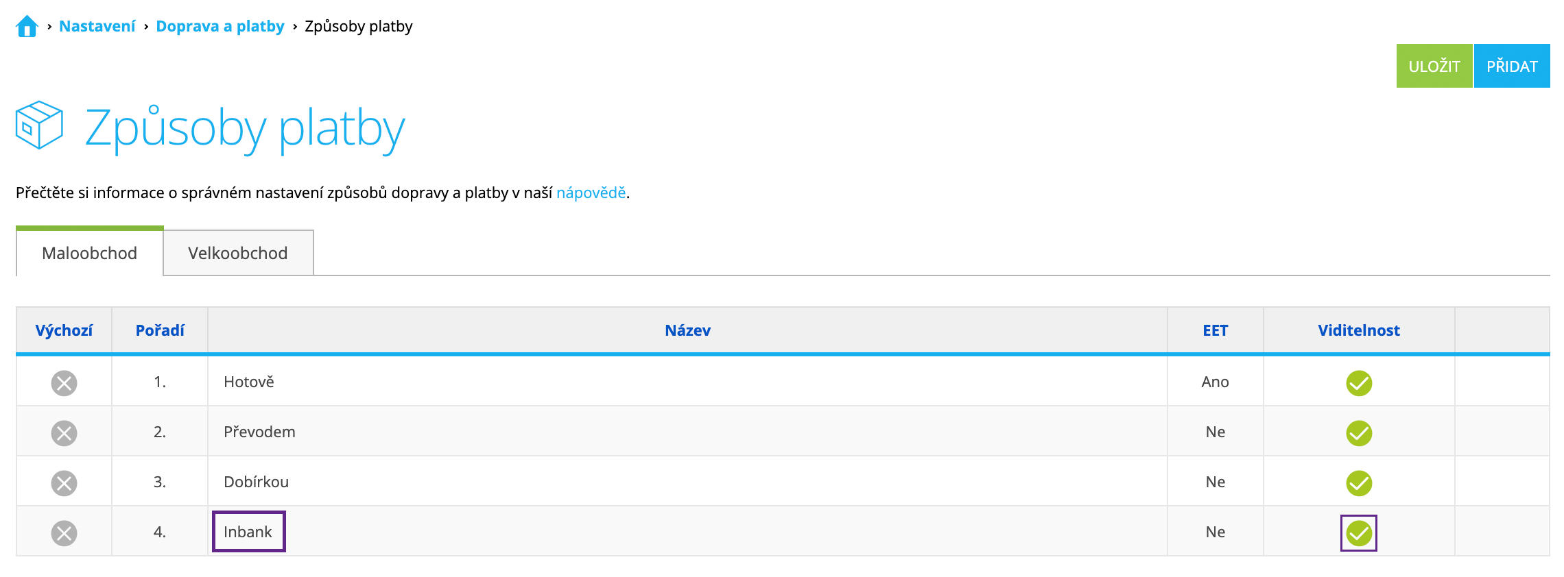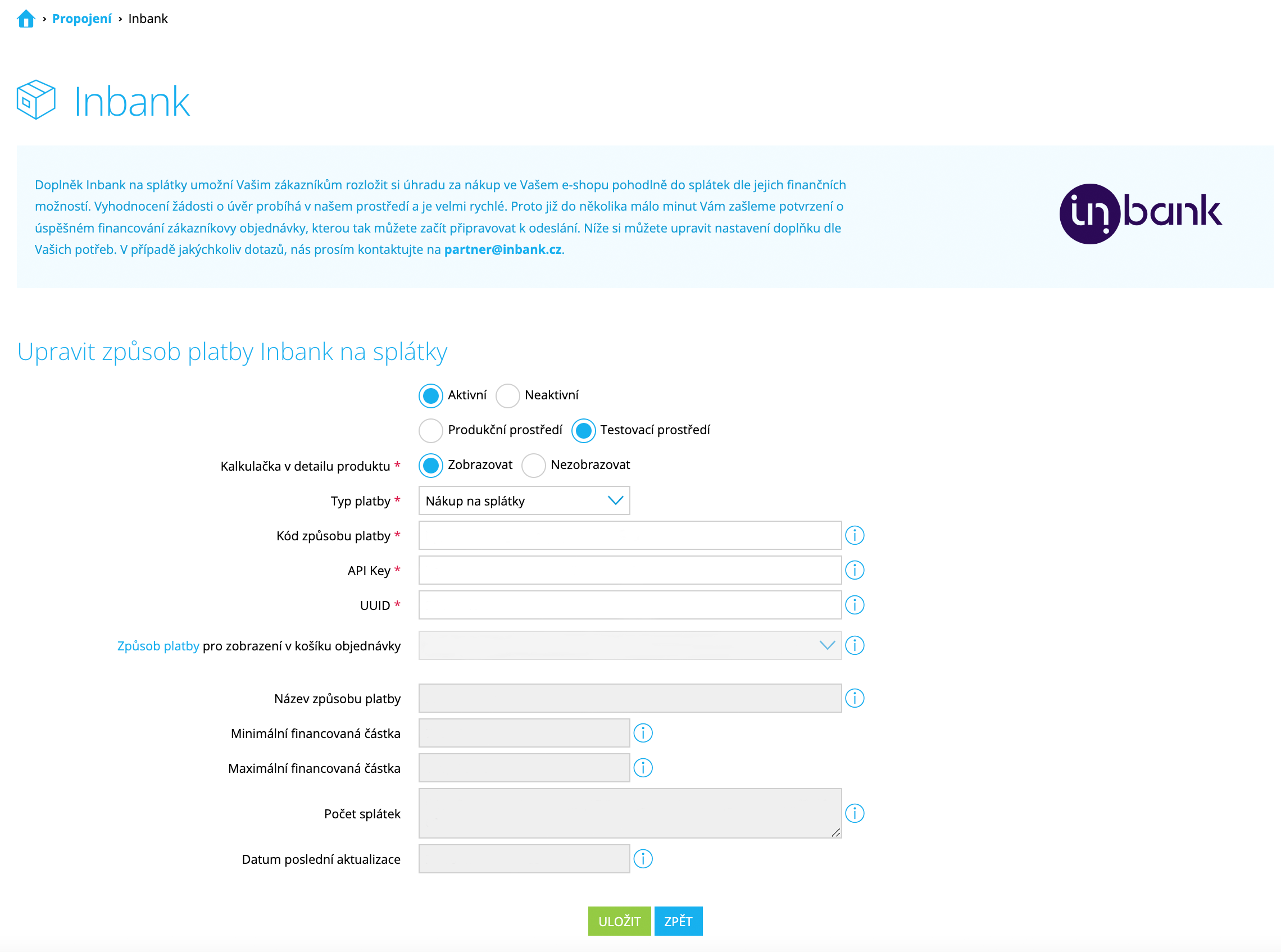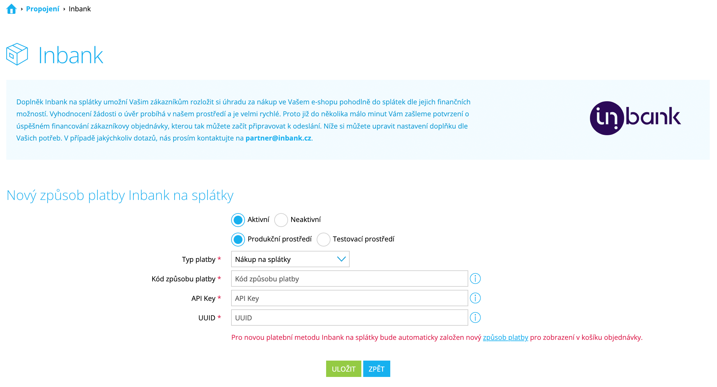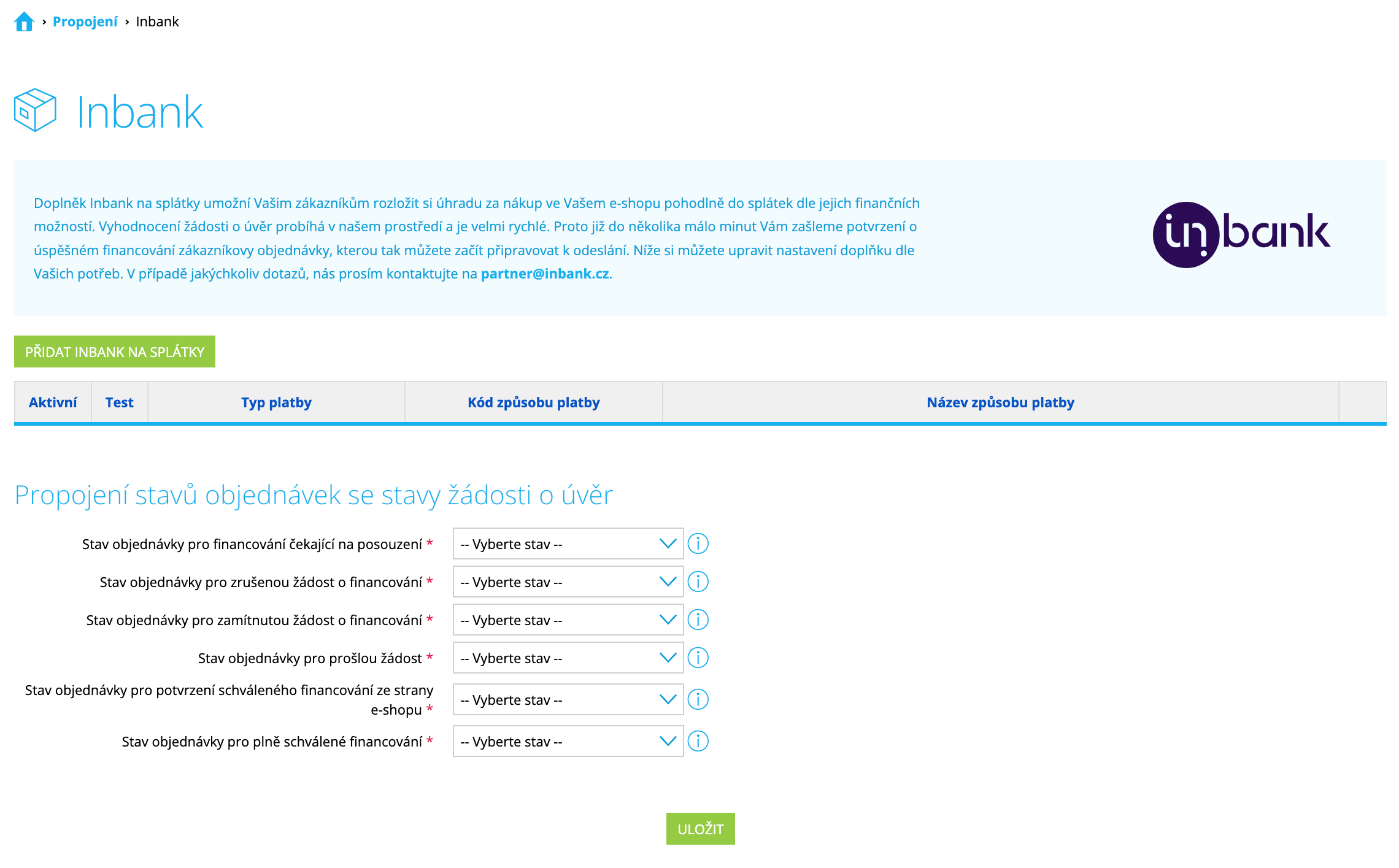 Po kliknutí na tlačítko Uložit se zadané údaje zkontrolují a v případě správného vyplnění se nová platební metoda Inbank na splátky vytvoří.