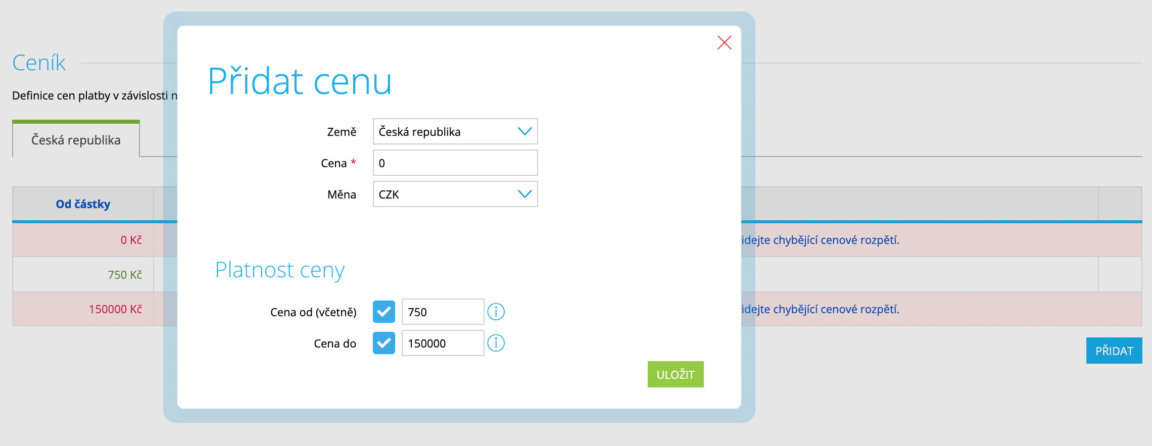 Rozmezí částek, kdy se bude způsob platby Inbank zobrazovat v košíku nastavíte kliknutím na tlačítko Přidat. Zobrazí se vám okno, kam zapíšete stejné hodnoty jako minimální a maximální financované částky.