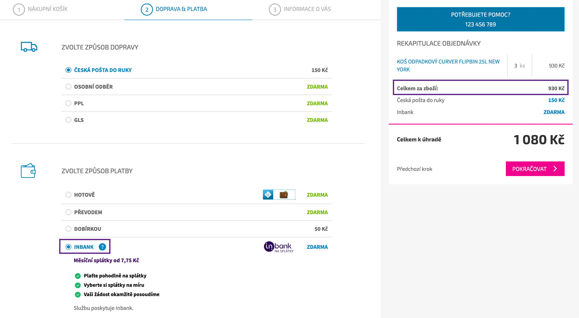 Způsob platby Inbank se v košíku zákazníkům objeví vždy, kdy je částka objednávky v definovaném rozmezí financování úvěrem Inbank. Shoptet počítá částku objednávky z cen zakoupených produktů, tj. bez poplatků za poštovné a balné.