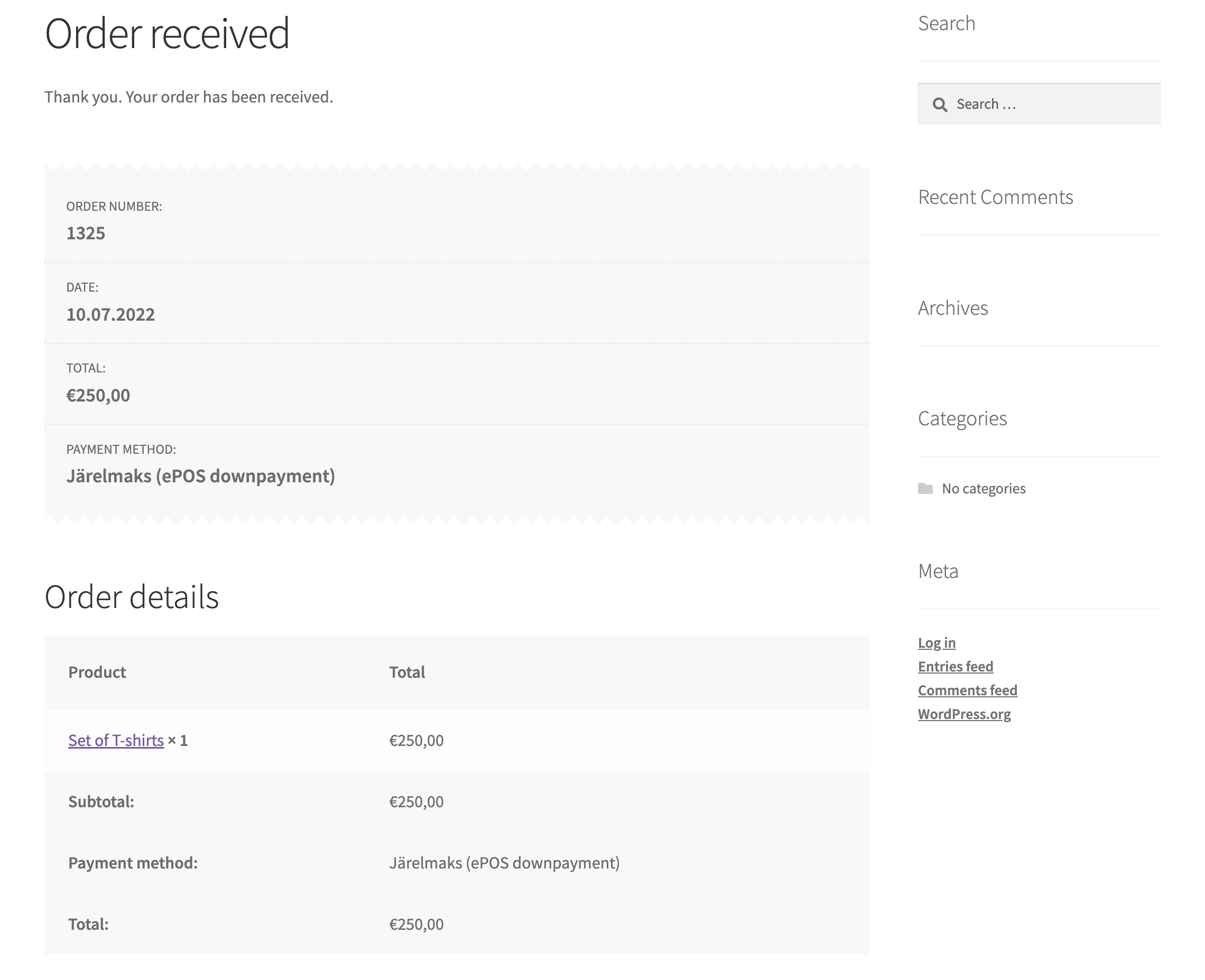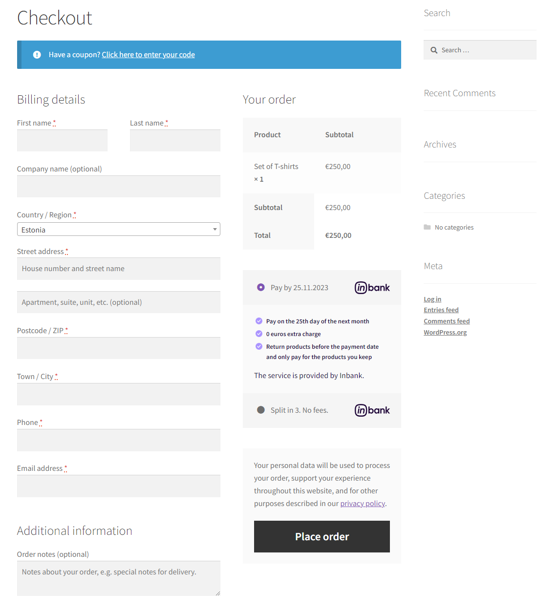 Note that the following screenshots are only demonstrational. The actual way the Inbank payment methods appear in your WooCommerce store depends on the storefront theme, plugin settings, the Inbank branch with which you have concluded the contract and the locale of your store.