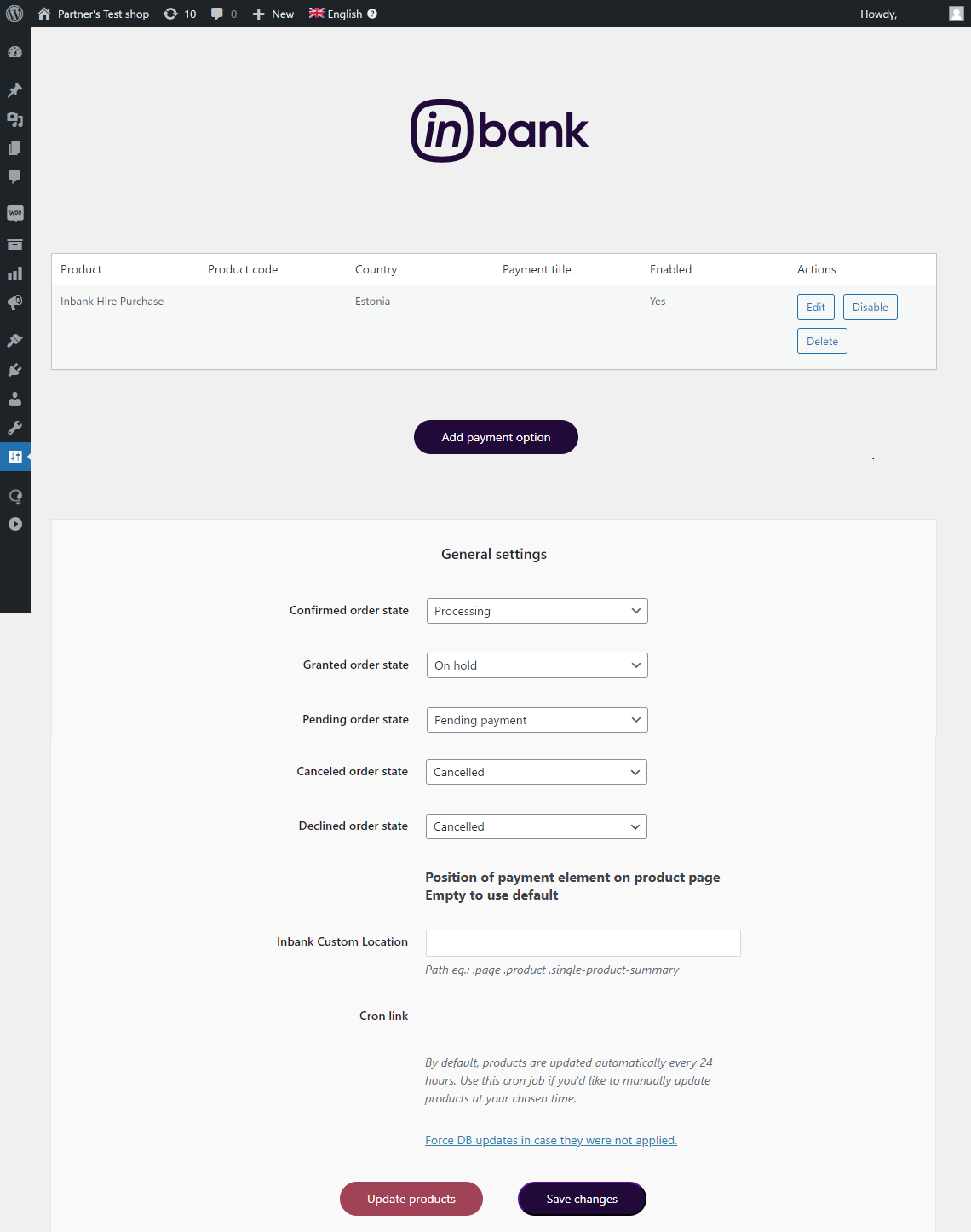 By default the data retrieved from Inbank over API is updated every 24 hours. If you would like to run the data update at a different interval, the General Settings section includes the cron job link which can be used for that. We recommend updating data once every 24 hours, from 00:00 AM to 06:00 AM. Additionally, under the General Settings section you can click the Update products button for a one-time product data update at any time you'd like.